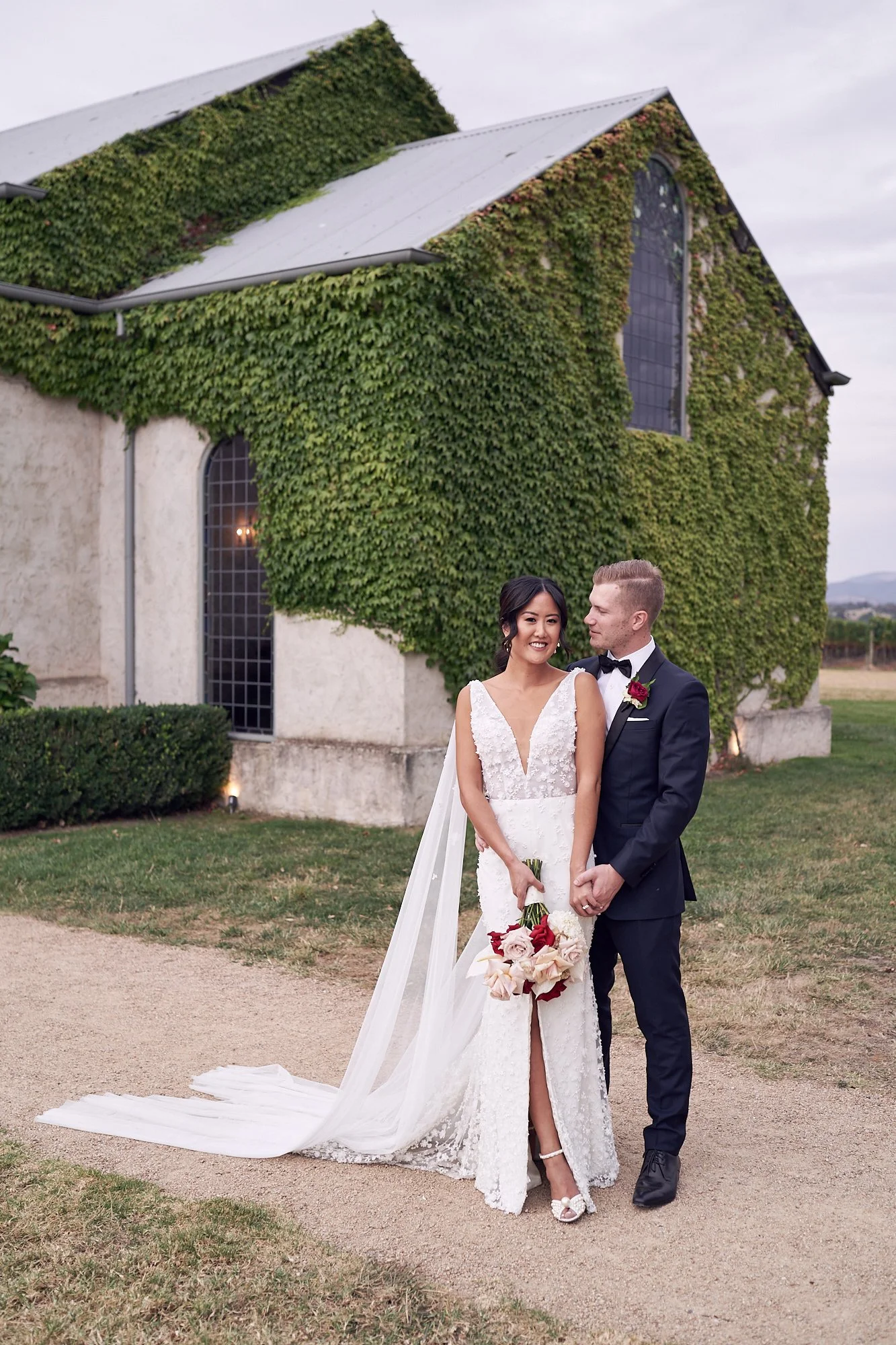 Beautiful Ange + Daniel held their elegant wedding at our all time favourite venue, Stones Of The Yarra Valley. With a gorgeous colour theme of nudes, dusty pinks and pops of red, sugar bee flowers put together the most stunning floral arrangements. Angela wore a gorgeous wedding dress by Mariana Hardwick featuring delicate floral applique, a plunging V neckline and a high split. The sheer floating shoulder pieces dotting with floral applique followed Angela playfully in the breeze. We can’t not mention Angela’s insanely gorgeous Jimmy Choo pearl heels and her elegant Maison Sebben pearl earrings holding a delicately folded gold petal. Angela’s reception wedding dress was by Jason Grech and featured the most stunning beaded corset paired with a short tulle skirt. Daniel looked uber sharp in a Jack Black suit. The bridesmaids wore pastel pink dresses Shona Joy.