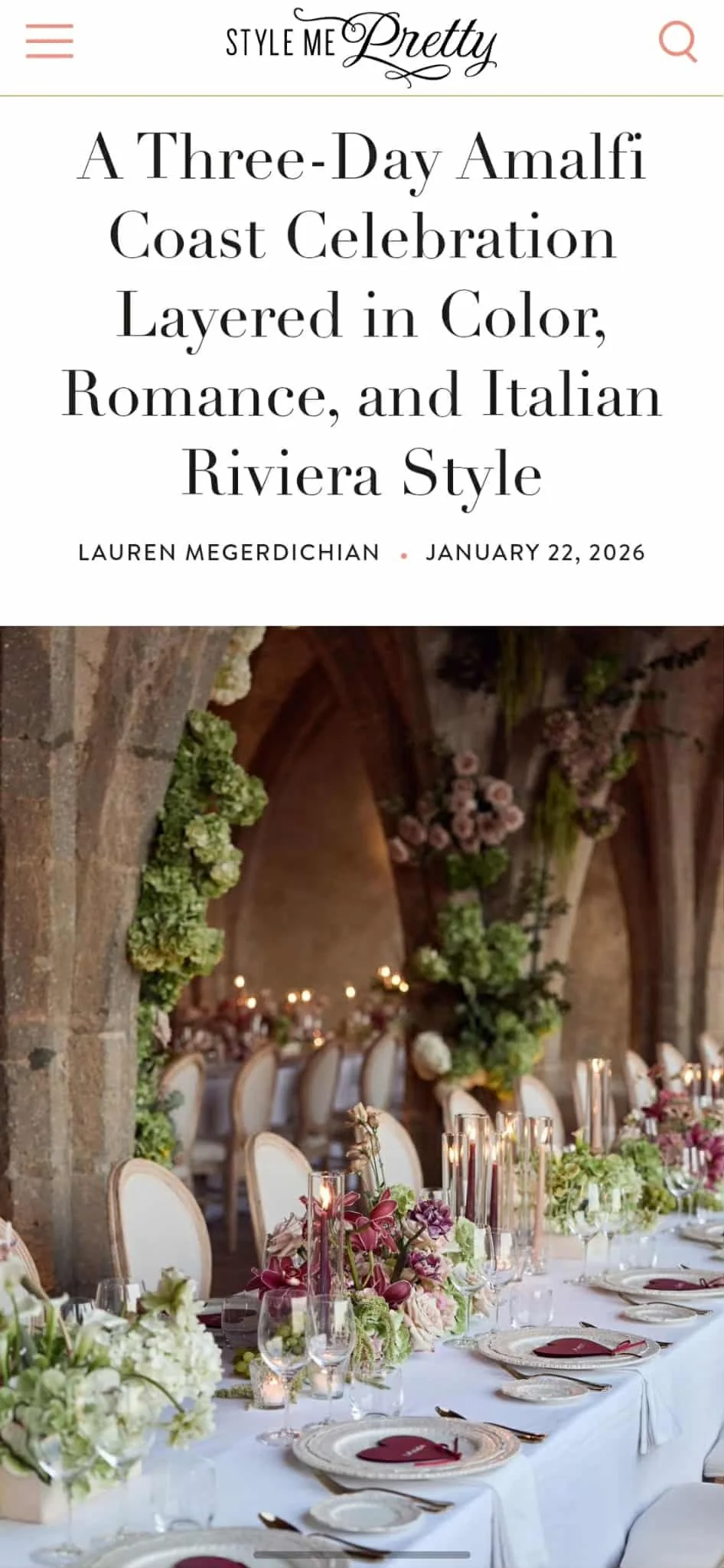 “Diaphanous drapery, sculptural lilies, and a single sweeping table transformed Borgo Stomennano into an ethereal celebration shaped by texture, light, and brilliant detail.”